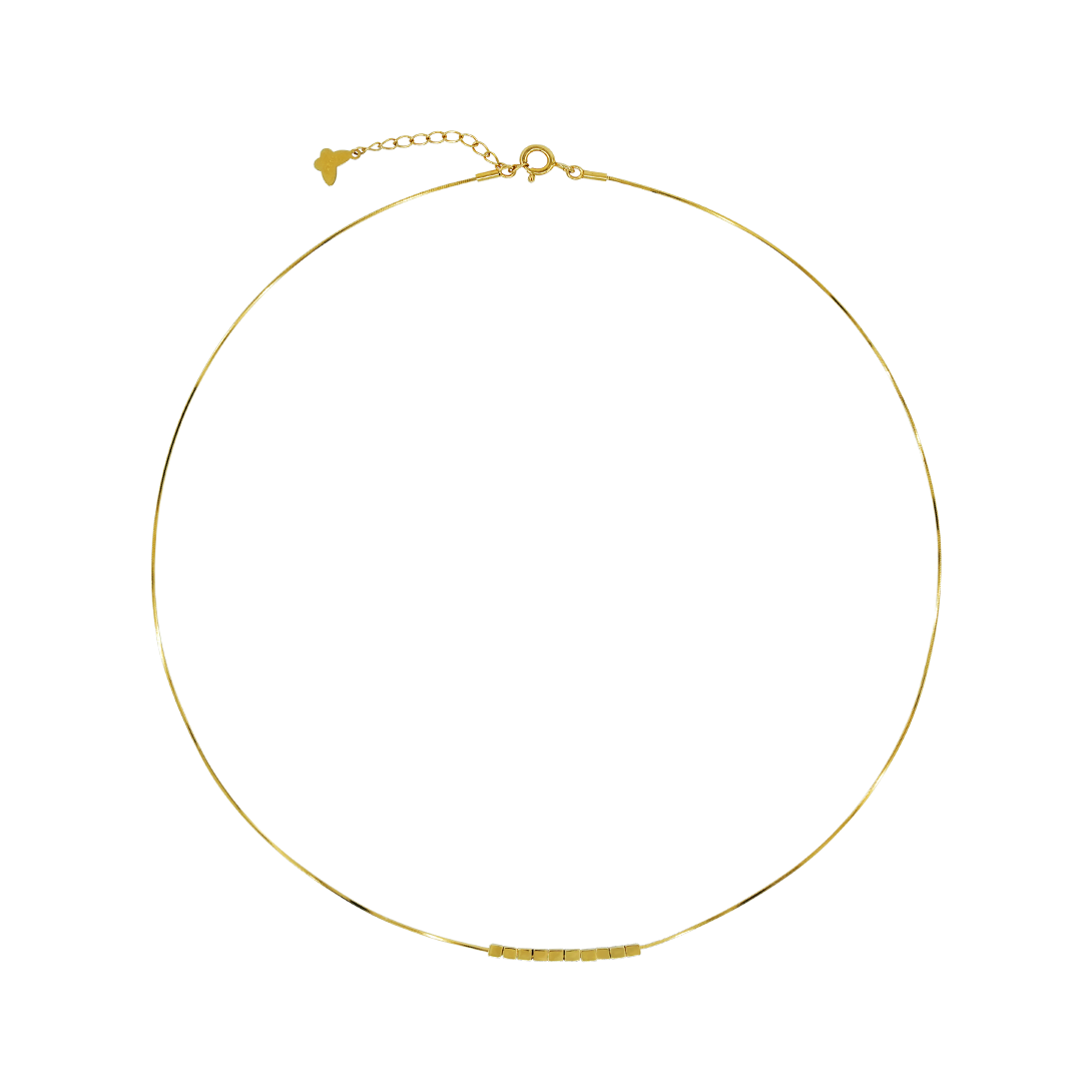 Nom Sucré ist eine zarte Kette aus 925er Silber, vergoldet, mit kleinen, quadratischen Anhängern, die an kleine Süßigkeiten erinnern. Jede „Zuckerkugel“ ist sorgfältig handgefertigt und auf der filigranen Kette platziert.