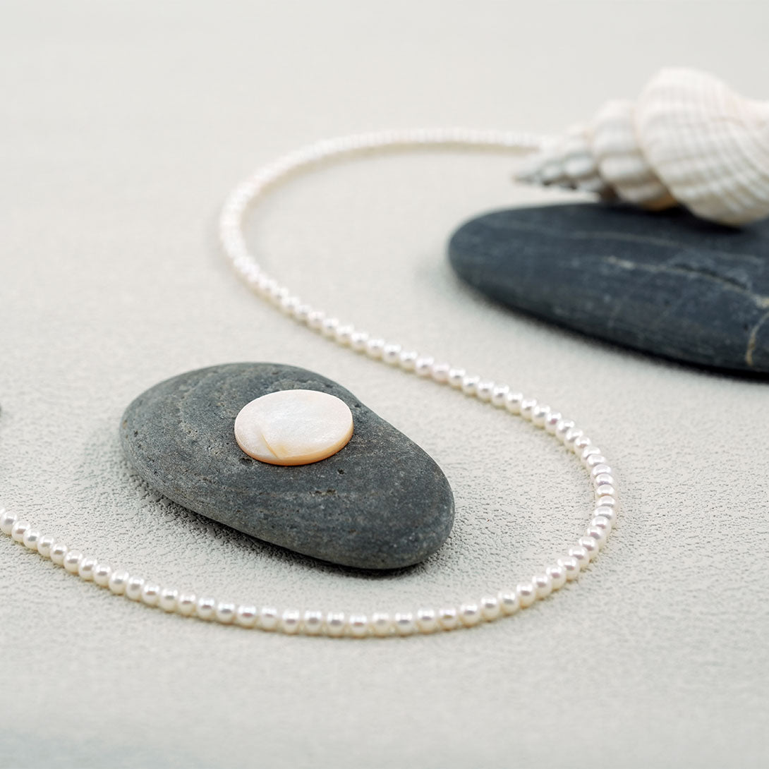 Wie kleine Tropfen von Morgentau liegt die „Perle de Rosée“ von VIREO sanft um den Hals. Jede Süßwasserperle ist 4 – 5 mm, perfekt rund und strahlt ein klares, sanftes Licht aus – handverlesen und liebevoll auf feine Schmuckseide gefädelt.